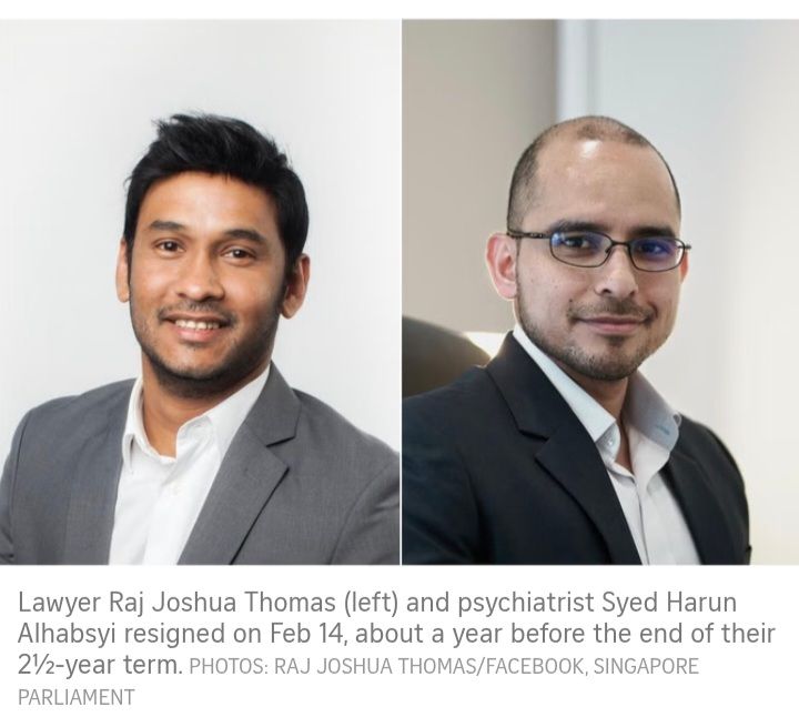 “SINGAPORE – Two Nominated Members of Parliament – lawyer Raj Joshua Thomas and psychiatrist Syed Harun Alhabsyi – resigned on Feb 14, the first time any NMP has done so before the end of his term. Parliament informed MPs about their resignations on Feb 14 in separate e-mails seen by The Straits Times. Their biodata was removed from the Parliament website the same day. The move has fuelled speculation that they could be fielded as candidates in the coming general election.” https://www.straitstimes.com/singapore/politics/nominated-mps-raj-joshua-thomas-syed-harun-alhabsyi-resign#:~:text=SINGAPORE%20%E2%80%93%20Two,coming%20general%20election.
